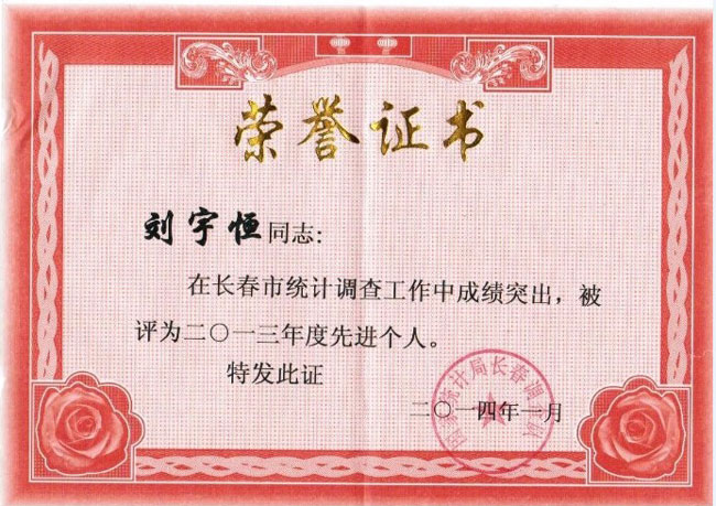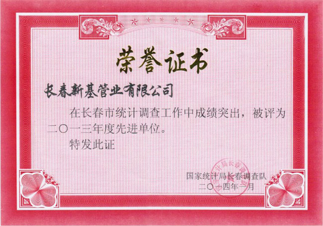2014年1月份 我公司在長春市統(tǒng)計(jì)調(diào)查工作中成績突出,被評(píng)為二O一三年度先進(jìn)單位,公司董事長被評(píng)為先進(jìn)個(gè)人