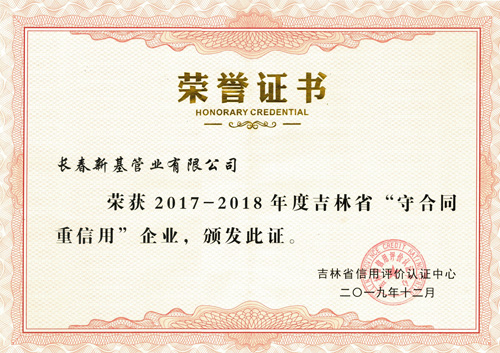 新基管業(yè)榮獲2017-2018年度吉林省“守合同重信用”企業(yè)